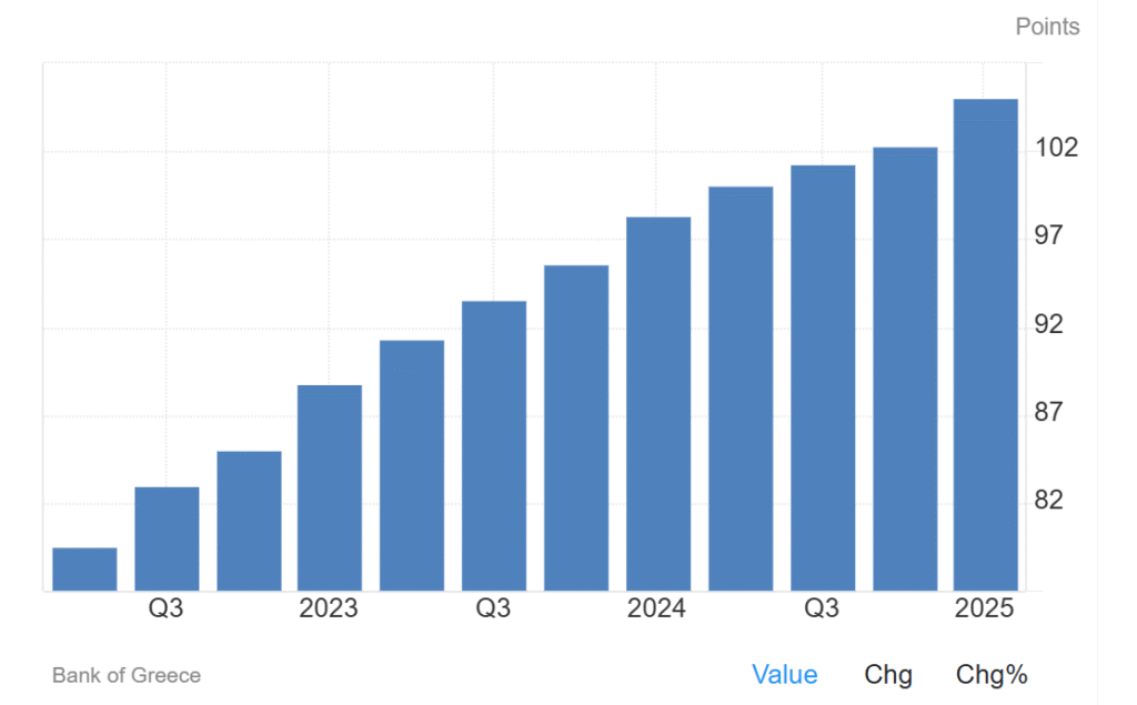 *גרף  המציג עליית מחירי הנדל"ן ביוון. מקור: Bank Of Greece