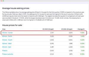מגמות מחירים בשוק הנדל"ן באתונה מצביעות על עלייה עקבית בשווי הנכסים והמרכיבים של שוק ההשכרה לטווח קצר. אתונה ממצבת את עצמה כמרכז של הזדמנויות משמעותיות, כאשר מדד המחירים של אתר Spitogatos מצביע על עלייה מרשימה של 11.8% במחירי הדירות למכירה במרכז העיר ברבעון הראשון של 2025.